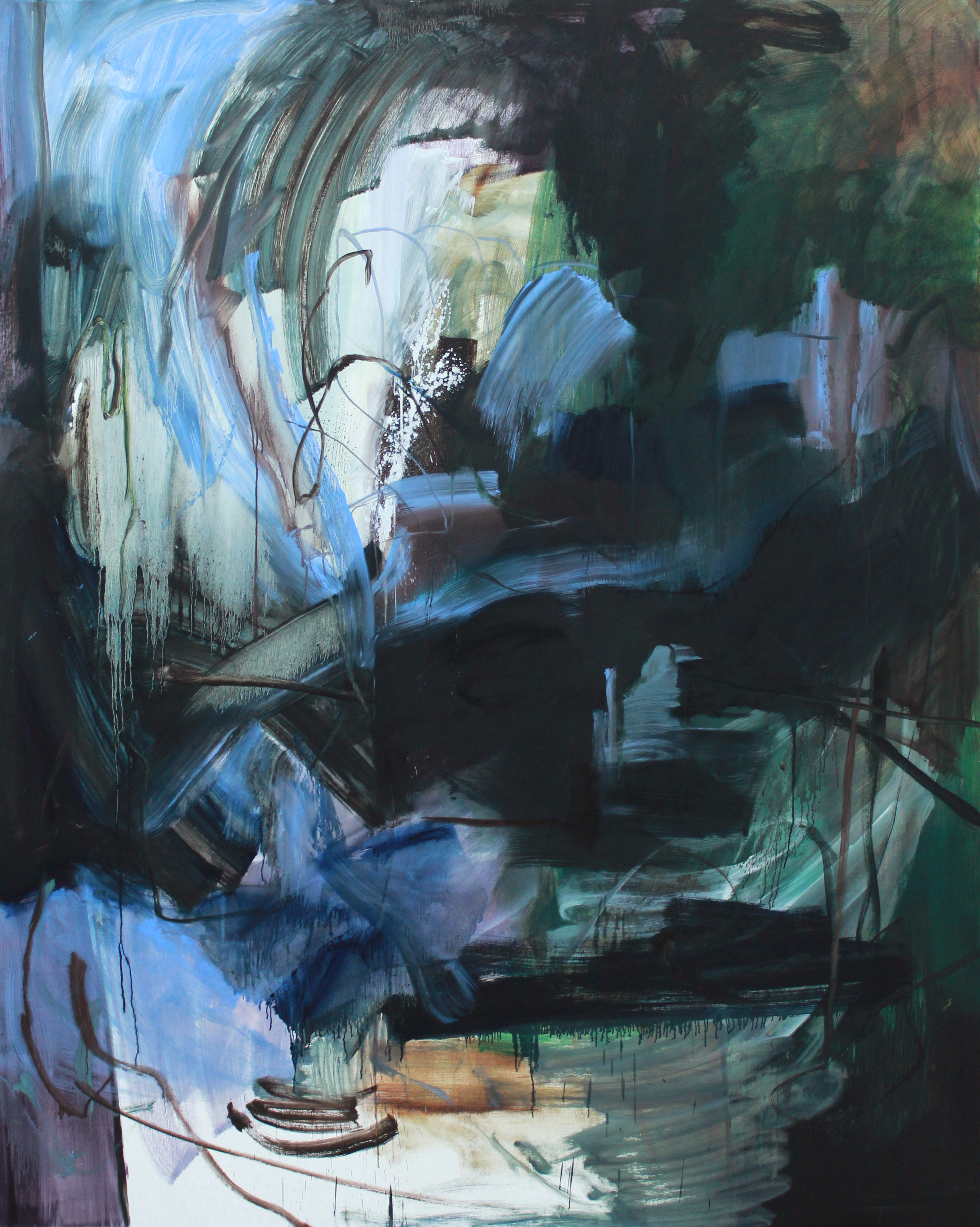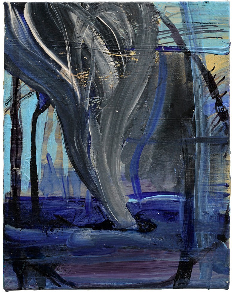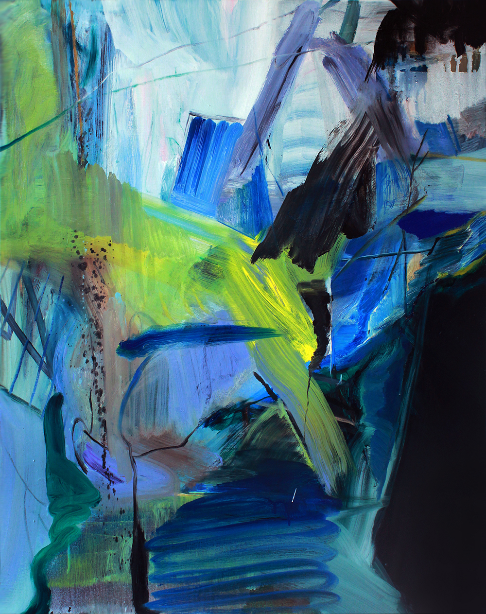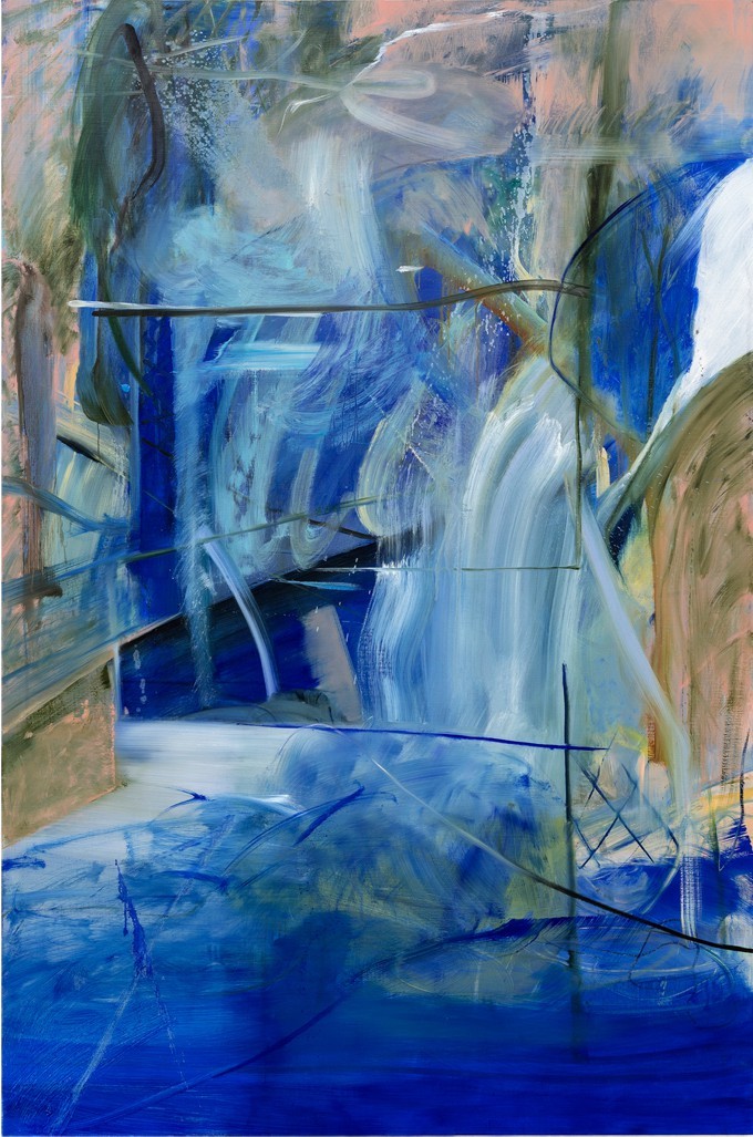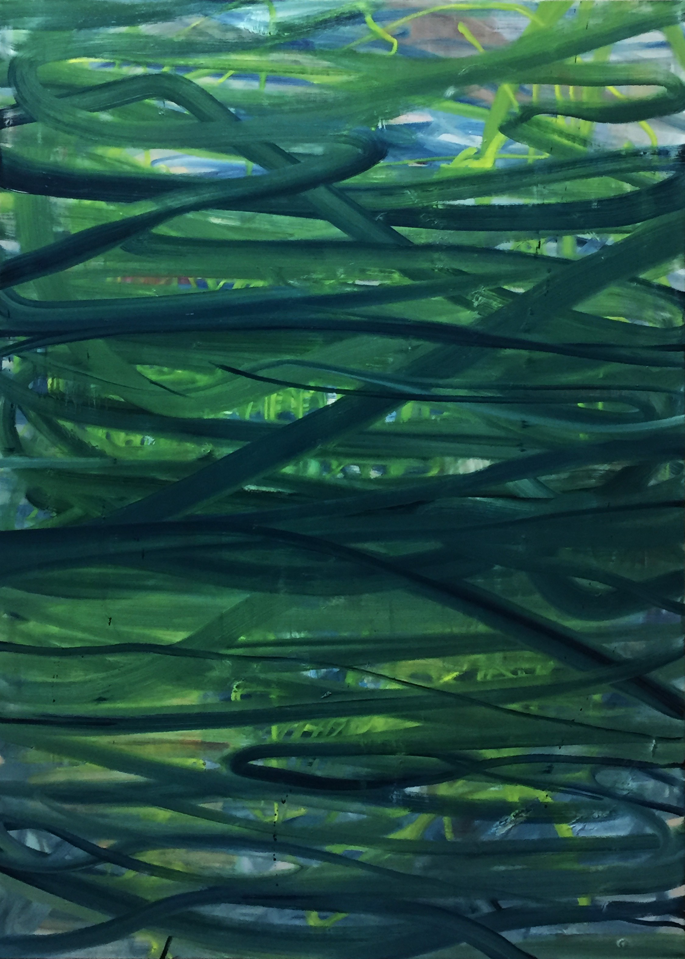 나는 '도시'란 단어를 보면 하나로 떠오르는 그림이 없다. 대신 청각, 촉각 혹은 어떤 상태가 연상되는데 예를 들면 공사장이라는 장소가 가진 임시적 상황, 지하철역 통로에서 사람과 사람이 부딪힐 때 쾅! 하고 둘 사이의 공간에 균열이 가는 소리-이미지, 러닝머신 벨트의 무한반복, 강물의 비릿한 악취 등 출렁이듯 흘러가고 대기 중에 떠다니는 상태가 연상된다. 다시 말해, 내가 사는 공간에 대한 위치와 정의는 고정된 것이 아니라 계속 변화하는 비정형의 어떤 것이다. 이번 전시 『블루 바이널 커튼』에 출품한 「얼굴 – 풍경」연작(2019)은 「Trick Mirror」(2009)의 연장선에 있다. 그러나 최근 작업에서는 이전보다 더 유동적이고 가변적인 요소에 집중했으며, 공기의 떨림이나 미세한 소음 등 순간적인 감각에 의존하며 작업했다. 또한, 예전 작업에서 보이는 얼굴 형태를 인지할 수 있는 선이나 묘사 등을 제거하려 했는데, 얼굴의 직접적인 묘사나 정보를 제시하기 보다는 오늘 날을 사는 사람들이 느끼는 미묘한 불안을 여러 겹 찍어내듯 보여주려 했다.